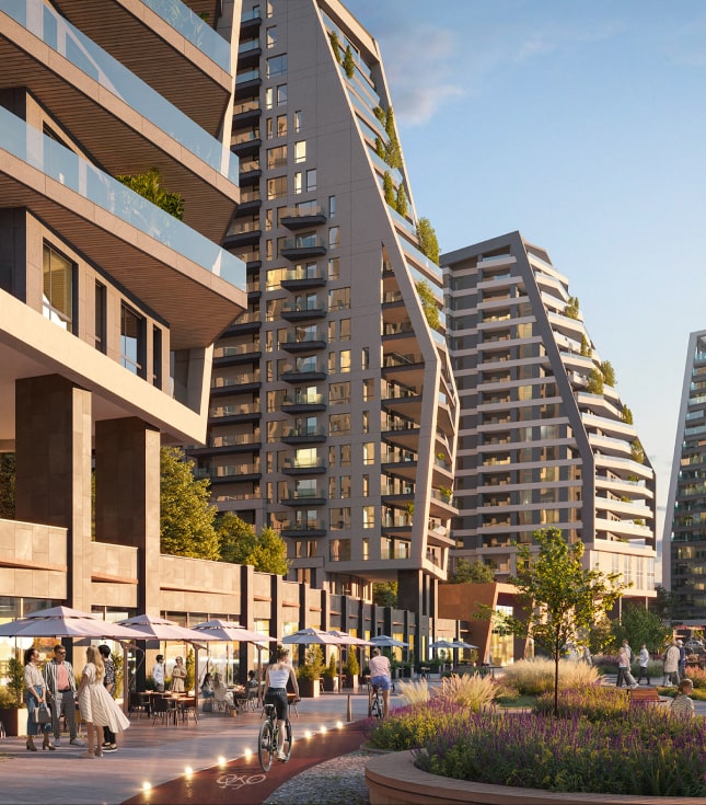 Il verde non è solo elemento decorativo, ma parte integrante del vivere quotidiano. Gli spazi pubblici, le connessioni pedonali e ciclabili, l’equilibrio tra densità e apertura rendono OLTREFERROVIA un modello possibile di urbanità gentile.